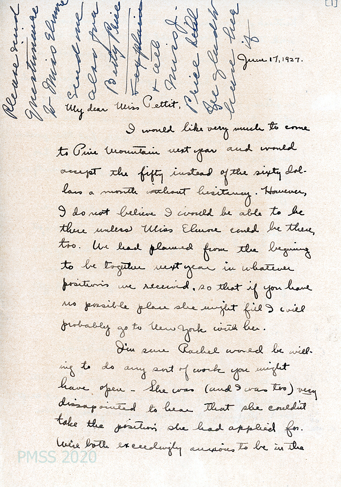 [008], [008a] June 17, 1927. Two-page handwritten letter to Pettit from Price. (Notation at top of letter in Pettit’s handwriting instructs that a questionnaire is sent to Miss Elmore and Betty Price.) [008] Price accepts a salary of $50 a month, but asks if there would be a place for Miss Rachel Elmore as well. “We had planned from the beginning to be together next year in whatever positions we received….” [008a] If it isn’t possible for Price and Elmore to come to PMSS, she suggests her cousin, Betty Price, as a substitute, who is 21 years old and also from Denison. Provides her home address in Chicago. In a postscript, she tells Pettit she would be glad to help with gardening; “at craft work, however, I would probably be of more use.”