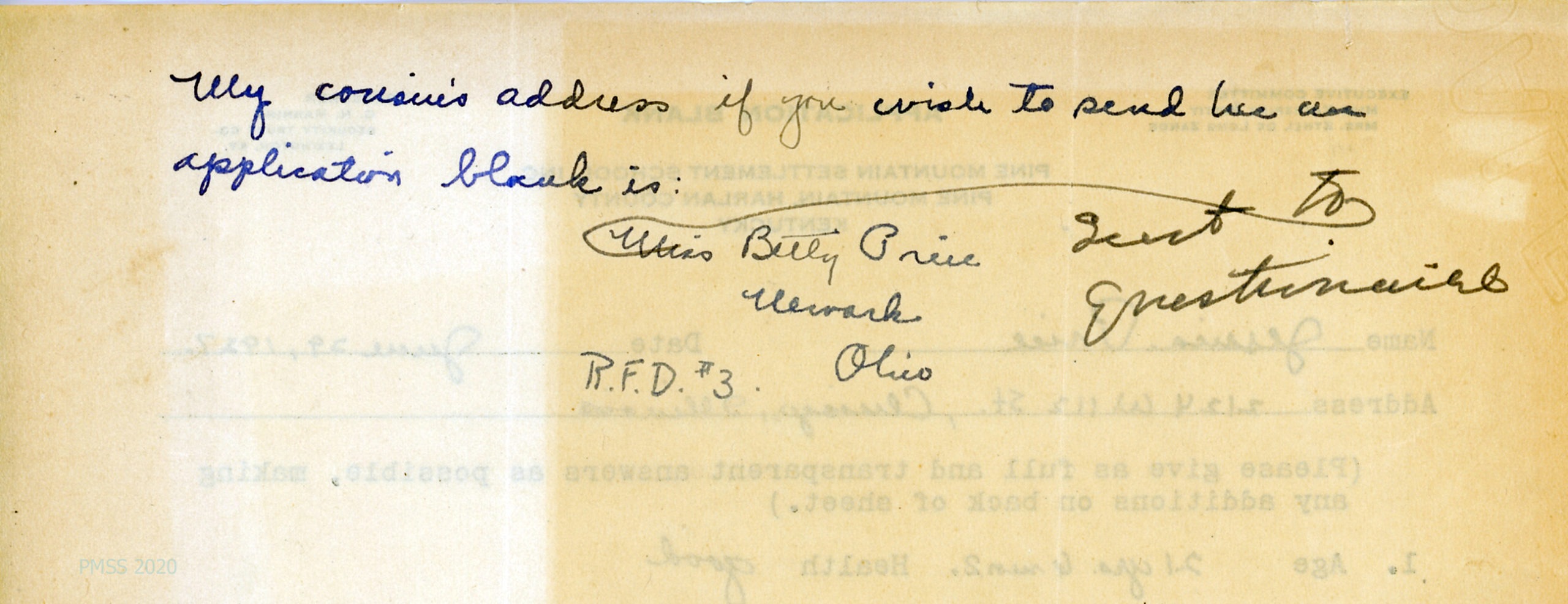 [010a] Her cousin’s address: Betty Price, Newark, Ohio. Notation: “Sent… questionnaire.”