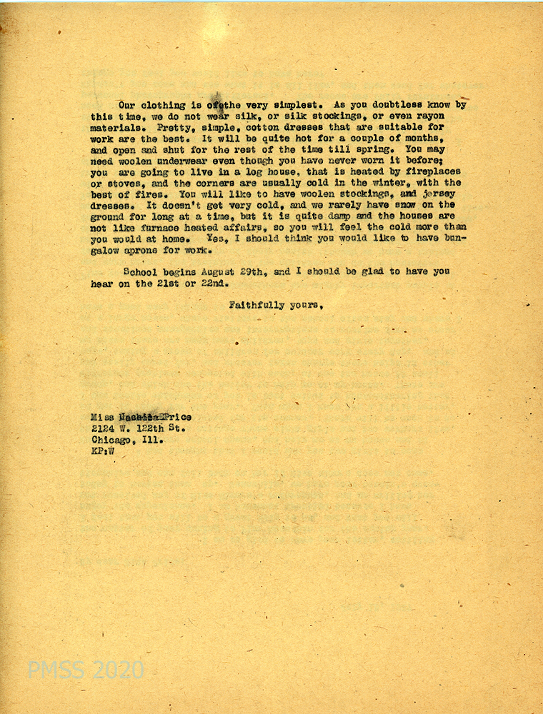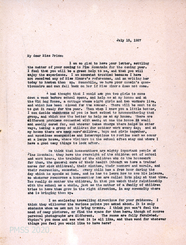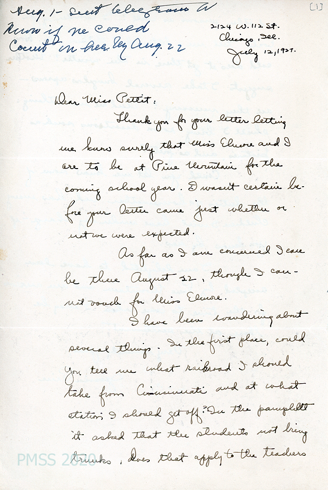[012], [012a] July 8, 1927. Two-page handwritten letter to Pettit from Price, [012] assuring she will arrive at PMSS on August 22, “though I cannot vouch for Miss Elmore.” [012a] Asks about travel directions; what to bring (such as “bungalow aprons”), housemother duties.