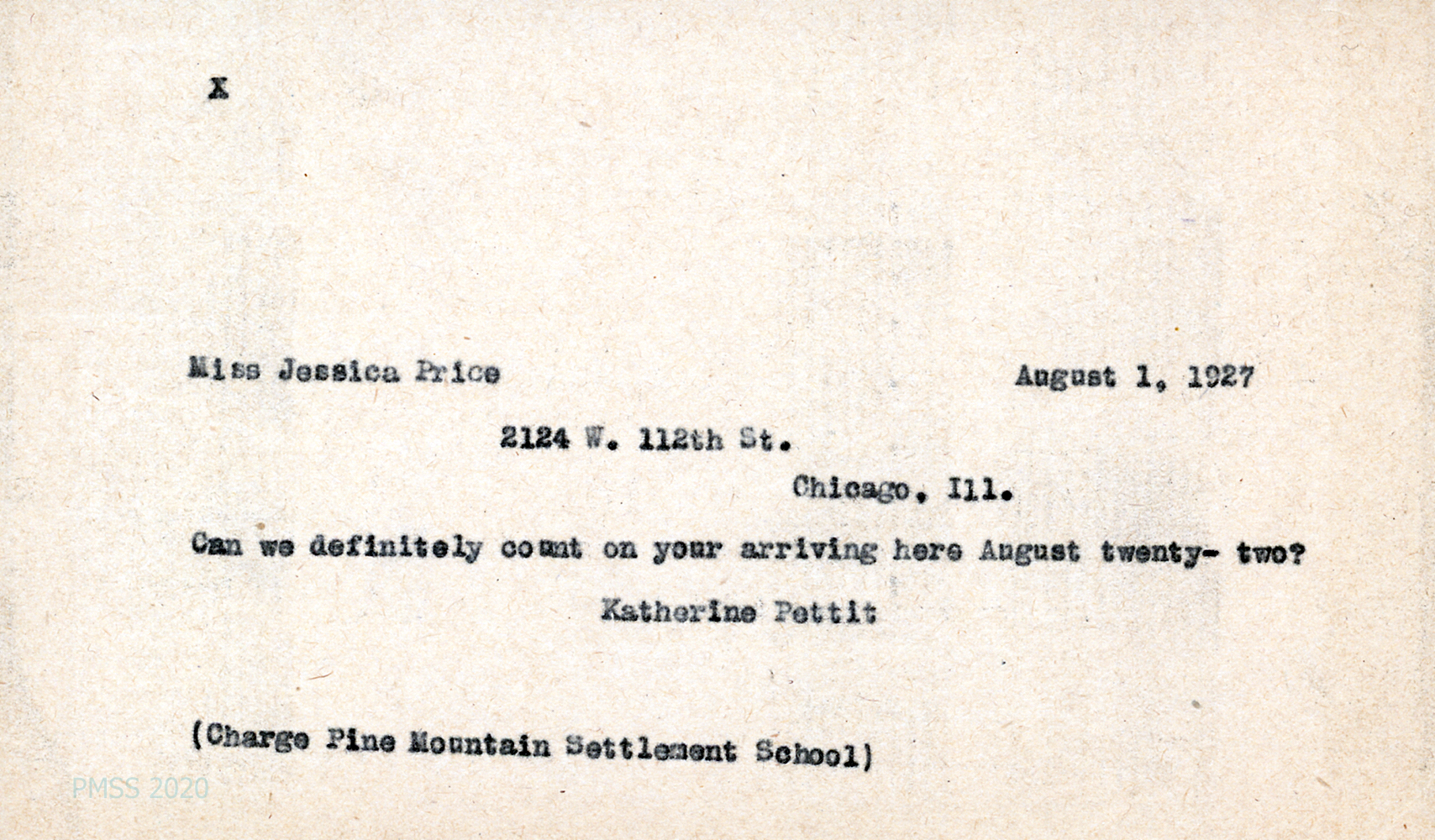 [014] July 30, 1927. To Pettit from Price. Miss Elmore and Jessica’s cousin have accepted positions at a Philadelphia newspaper and won’t be coming to PMSS. [014a] Assures Pettit she will arrive at PMSS on August 22.