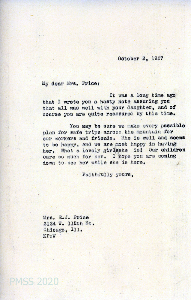 [016] October 3, 1927. To Mrs. (E.J.) Price from KP (Pettit). Assures her that her daughter is “well and seems to be happy and we are most happy in having her. … Our children care so much for her.” Invites Mrs. Price to visit PMSS.