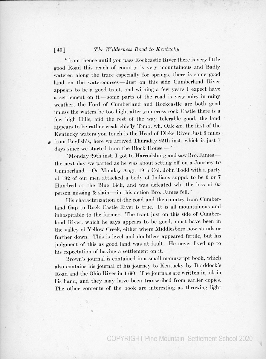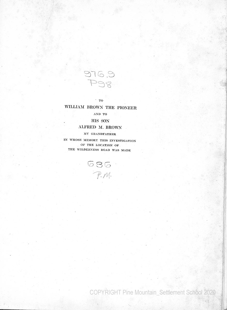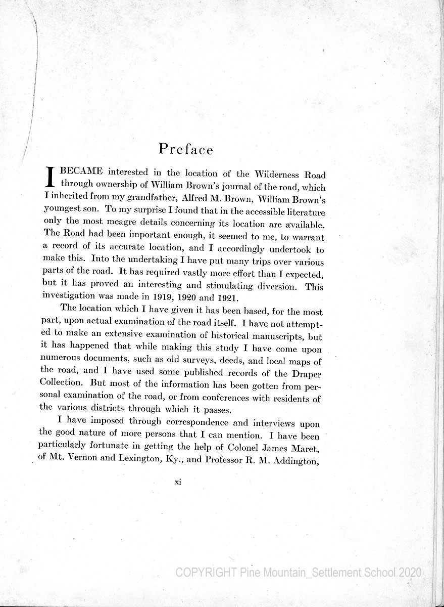 I became interested in the location of the Wilderness Road through ownership of William Brown’s journal of the road, which I inherited from my grandfather, Alfred M. Brown, William Brown’s youngest son. To my surprise, I found that in the accessible literature only the most meager details concerning its location are available. The Road had been important enough, it seemed to me, to warrant a record of its accurate location, and I accordingly undertook to make this. It has required vastly more effort than I expected, but it has proved an interesting and stimulating diversion. This investigation was made in 1919, 1920, and 1921.