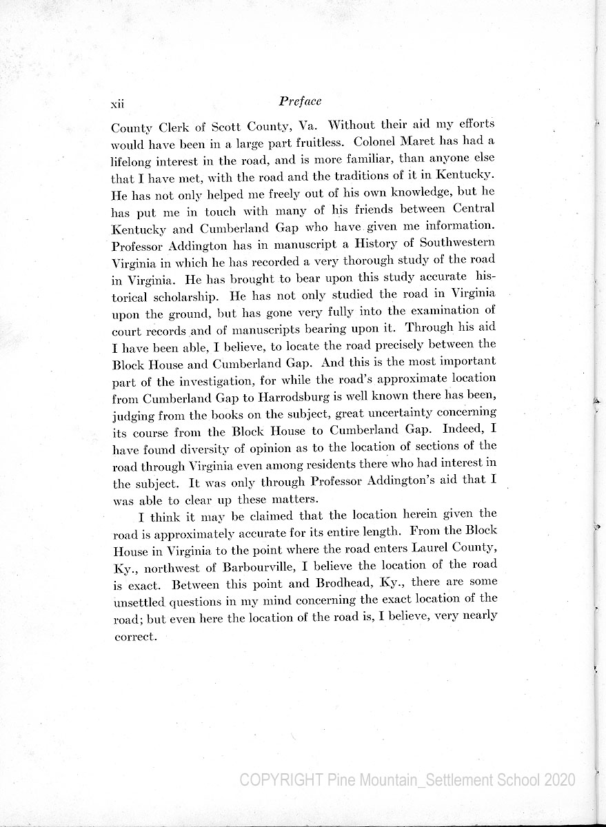 I have been particularly fortunate in getting the help of Colonel James Maret, of Mt. Vernon and Lexington, KY., and Professor R.M. Addington, County Clerk of Scott County, Va. Without their aid, my efforts would have been a large part fruitless. Colonel Maret has had a lifelong interest in the road and is more familiar, than anyone else that I have met, with the road and the traditions of it in Kentucky. He has not only helped me freely out of his own knowledge, but he has put me in touch with many of his friends between Central Kentucky and Cumberland Gap who have given me information. Professor Addington has in manuscript a History of Southwestern Virginia in which he has recorded a very thorough study of the road in Virginia. He has brought to bear upon this study accurate historical scholarship. He has not only studied the road in Virginia upon the ground but has gone very fully into the examination of court records and of manuscripts bearing upon it. Through his aid I have been able, I believe, to locate the road precisely between the Block House and Cumberland Gap. And this is the most important part of the investigation, for while the road’s approximate location from Cumberland Gap to Harrodsburg is well known there has been, judging from the books on the subject, great uncertainty concerning its course from the Block House to Cumberland Gap. Indeed, I have found diversity of opinion as to the location of sections of the road through Virginia even among residents there who had interest in the subject. It was only through Professor Addington’s aid that I was able to clear up these matters.