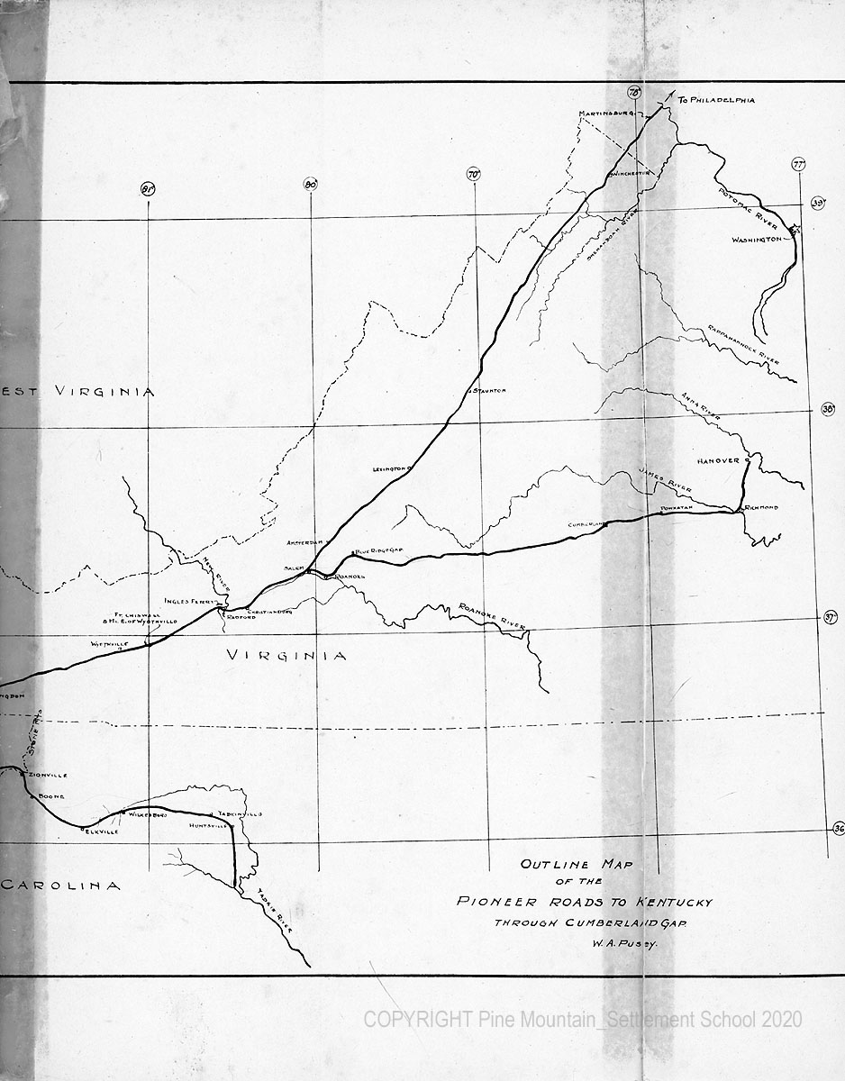TAGS: Wilderness Road, Kentucky, William Allen Pusey, Harlan County, pioneers, settlement patterns, roads, Indians, Thomas Clark, Daniel Boone, Powell Valley, Middlesboro Kentucky, Duffield Virginia
