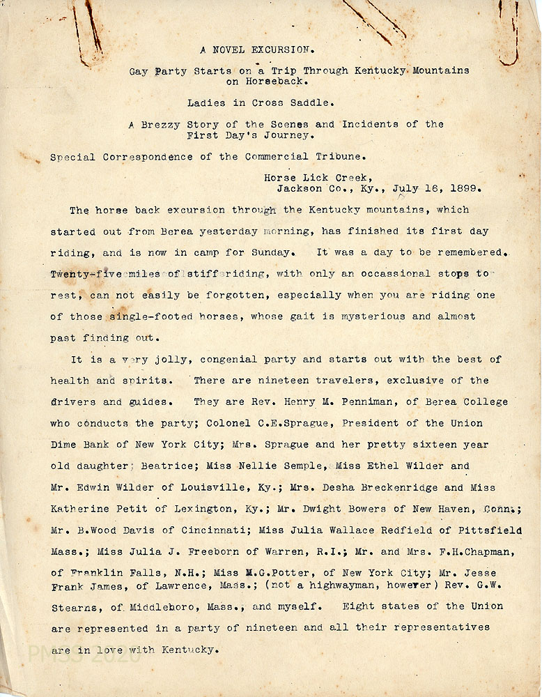 The following serialized news reports by Maria McVay describe the journey organized in July 1899, by the Rev. Henry M. Penniman of Berea College. The tour was comprised of a group of nineteen travelers and their drivers and guides. Miss McVay, a young writer, notes that the group of nineteen represented eight states and was held together by the shared sentiment that all “are in love with Kentucky.”