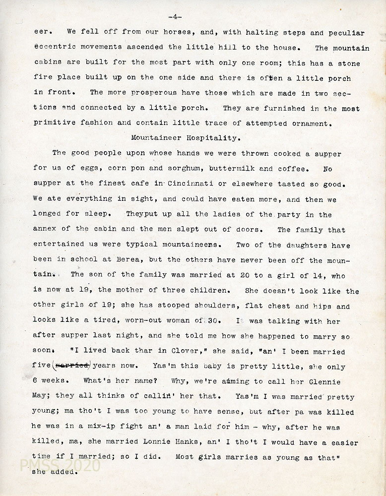 for us of eggs, corn pone and sorghum, buttermilk and coffee. No supper at the finest cafe in Cincinnati or elsewhere tasted so good. We ate everything in sight and could have eaten more, and then we longed for sleep. They put up all the ladies of the party in the annex of the cabin and the men slept out of doors. The family that entertained us were typical mountaineers. Two of the daughters have been in school at Berea, but the others have never been off the mountain. The son of the family was married at 20 to a girl of 14, who is now at 19 the mother of three children. She doesn’t look like the other girls of 19; she has stooped shoulders, flat chest and hips and looks like a tired, worn-out woman of 30. I was talking with her after supper last night, and she told me how she happened to marry so soon. “I lived back thar in Clover,” she said, “an’ I been married five years now. Yas ‘m, this baby is pretty little, she only 8 weeks.” What’s her name? “Why, we’re aiming to call her Glennie May; they all thinks of callin’ her that. Yas’m, I was married pretty young; ma tho’t I was too young to have sense, but after pa was killed –he was in a mix-up fight an’ a man laid for him — why, after he was killed, ma, she married Lonnie Hanks, an’ I tho’t I would have a easier time if I married; so I did. Most girls marries as young as that,” she added.