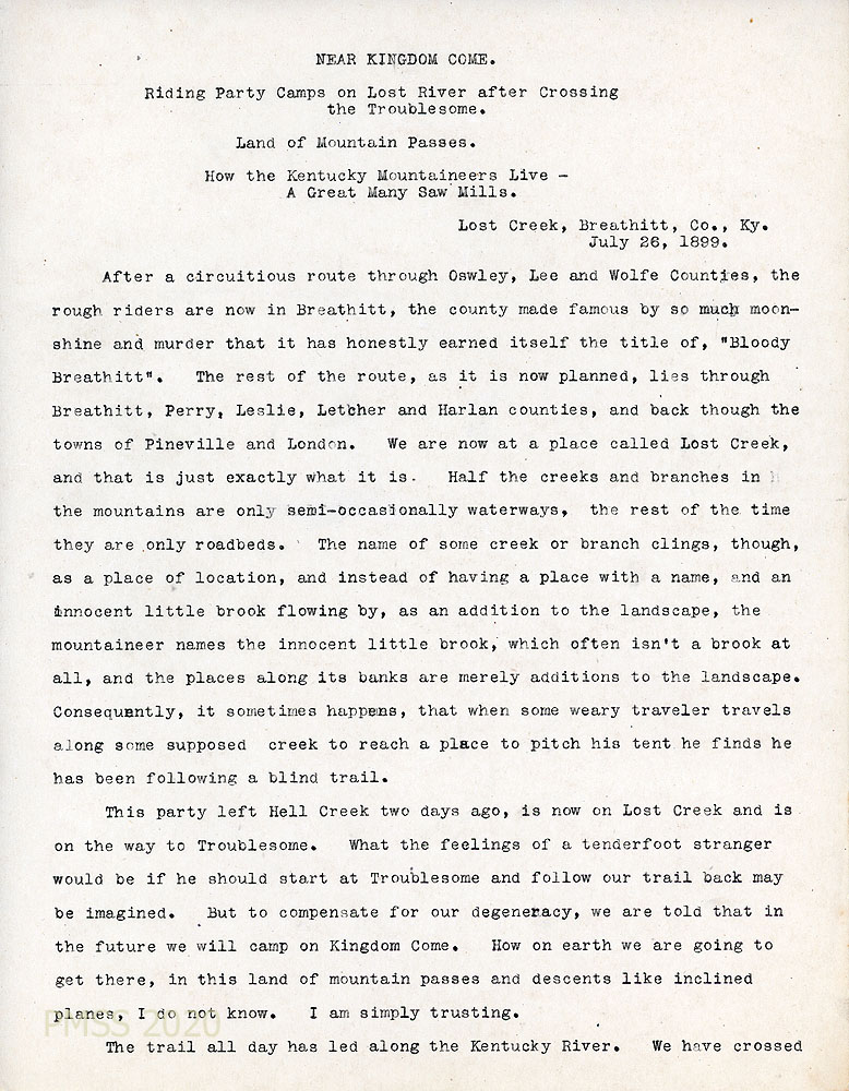 The party is now at Hazard, thirty-five miles from a railroad. The United States mail goes from here daily to Jackson, Breathitt County, in saddle bags, and is accompanied by a youth and a six-shooter. After this camp is struck, we intend to find and follow the Poor Fort [sic Fork] and to make for the Virginia line.