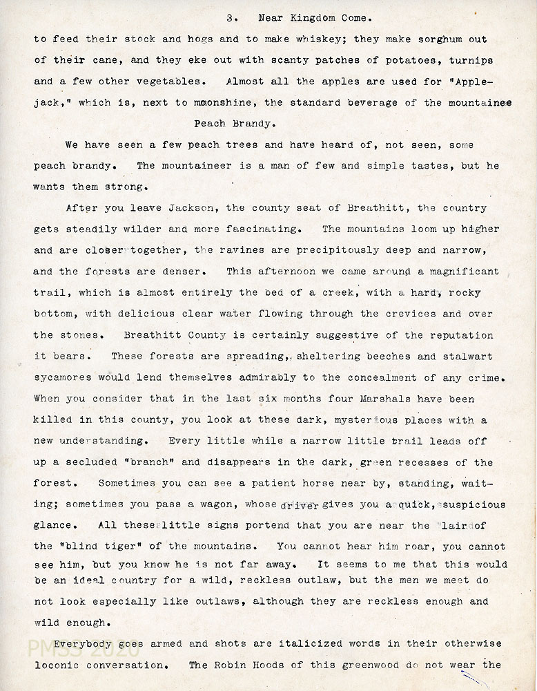 The ride through Owsley, Lee and Wolfe Counties is indicative of the pursuits of the people. Small farming and logging, in addition to a little tobacco and some passe orchards, offer the means whereby they live. They raise cane in the mountains too. I have watched the fields of corn growing on perpendicular hillsides, and wished that it was ploughing time or cultivating time, so that I could see how they do it . After a thoughtful course of reasoning, I have come to the conclusion that, by wearing spike shoes, they could hoe the corn, but imagination fails to show any method of plowing, Everywhere there [are] huge logs lying about, and in the Kentucky River they were chained together end to end, and lashed into rafts, ready for their long trip down into the level country.