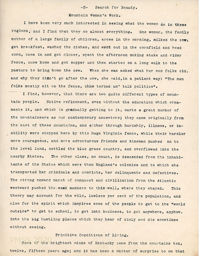 ” A Novel Excursion” is important to the history of Pine Mountain Settlement School as it is an account of Katherine Pettit’s first excursion into Harlan County. Her traveling companions were formative in Katherine Petti’s later development of Hindman Settlement School and of the Pine Mountain Settlement School, two of the earliest rural settlement schools in Kentucky. Of particular note is Pettit’s traveling companion Madeline McDowell Breckinridge, wife of Desha Breckinridge, editor and publisher of the Lexington Herald from 1897 to 1935. Madeline McDowell Breckinridge founded “a social settlement at Proctor, Kentucky’s Episcopal mission with the Gleaners of Christ Church Episcopal from 1899 to 1900.” Proctor is in Lee County, Kentucky near Beattyville, a stop in the groups journey. Proctor was modeled on Hull House founded by Jane Addams in Chicago and focused on child welfare, health, and women’s rights.