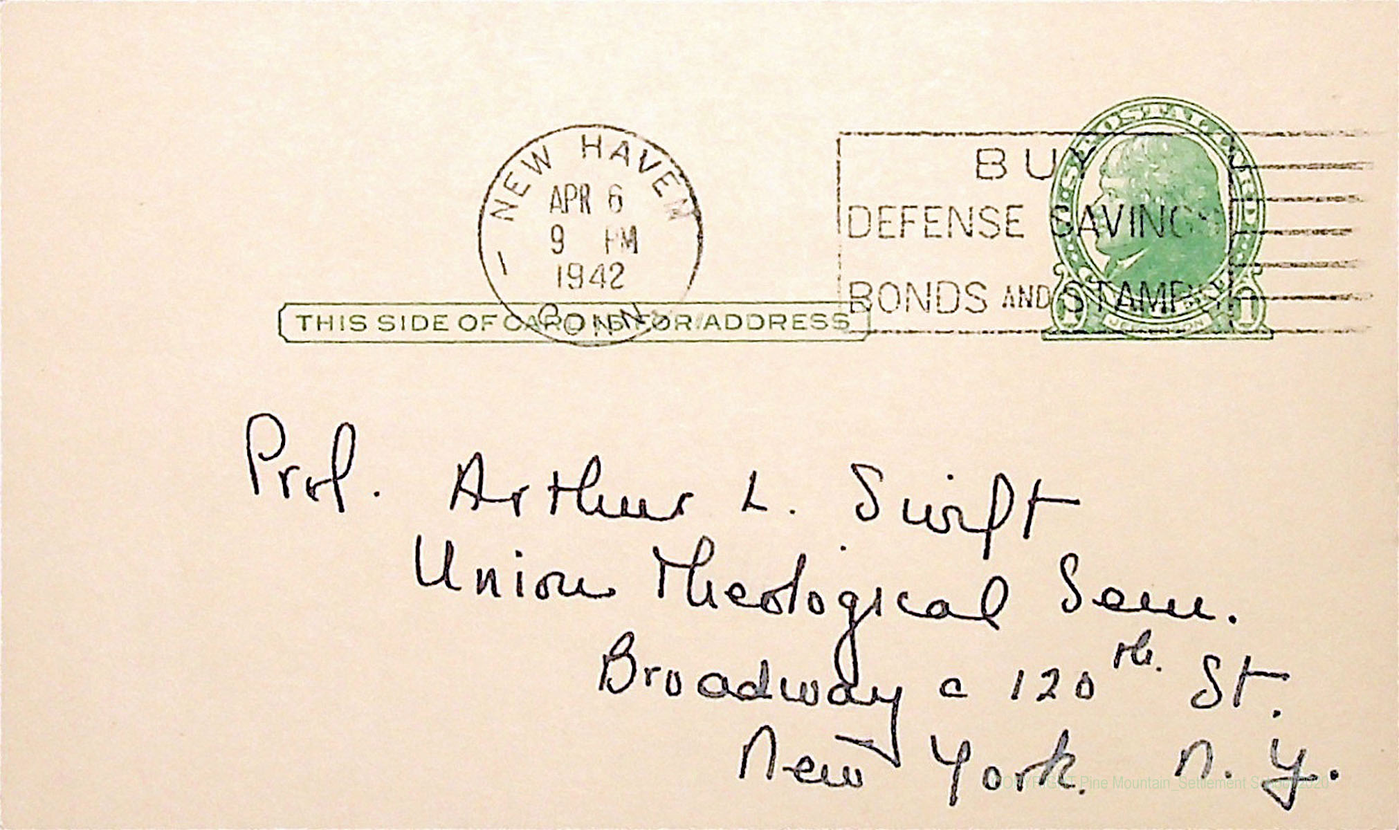 00015 (5) April 6, 1942. Address side of postcard to Prof. Arthur L. Swift, Union Theological Sem., New York, NY.