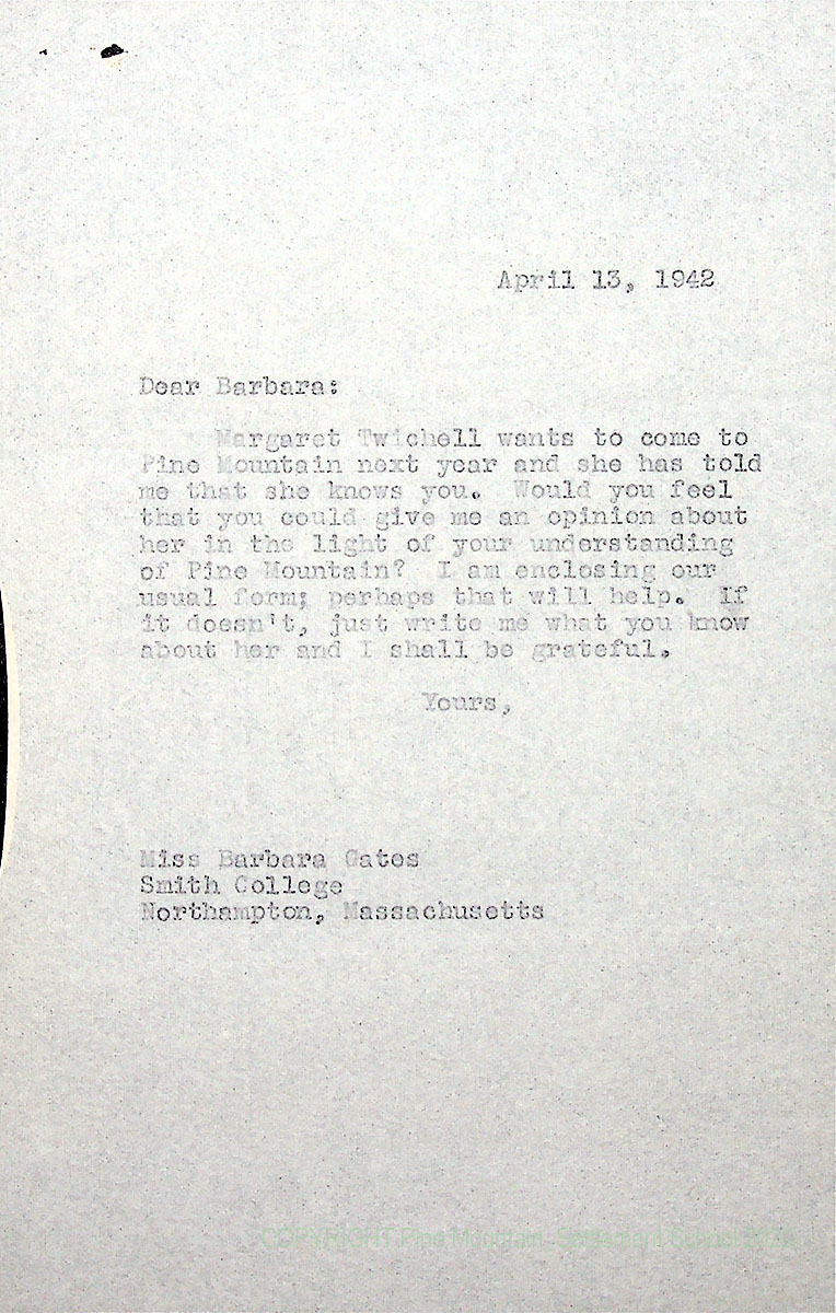 00015 (9) April 21, 1942. To Miss Barbara Gates, Smith College, Northampton, MA, from [unsigned], thanking her for sending a $10 check (in addition to her usual gift of $25) and for her “careful appraisal of Margaret Twichell…[It] is especially valuable because you know Pine Mountain and can see her in relation to it.” He plans to invite Twichell to the Kiwanis Camp to see if she likes PMSS; mentions that Mrs. [Berdina] Bishop may be in charge of the camp.