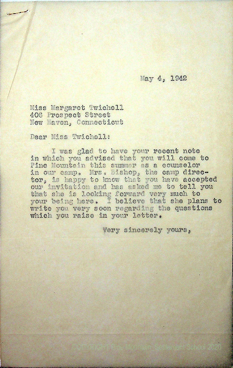 00015 (11) May 4, 1942. To Miss Twichell from [unsigned], who is glad she “will come to Pine Mountain this summer as a counselor in our camp.” Mrs. Bishop, camp director, will be writing to her.