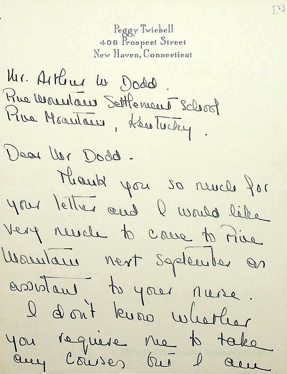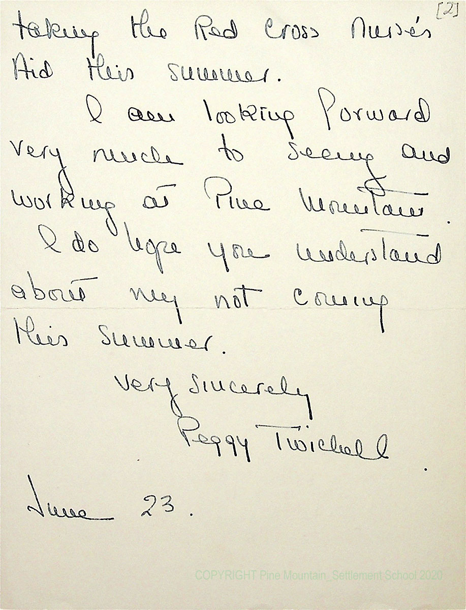 00015 (13) June 23, [1942]. N.D. Two-page handwritten letter to Arthur W. Dodd from Peggy Twichell in New Haven, CT, who [Page 1] thanks him for his letter and agrees to come to PMSS next September as nurse assistant. Asks if she needs to take any courses. 00015 (14) [Page 2]. She will be taking the Red Cross Nurse’s Aid course.