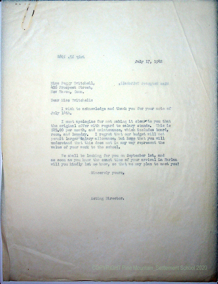 00015 (16) July 17, 1942. To Miss Twichell from [unsigned, Arthur Dodd], Acting Director. Thanks her for her July 14th note; clarifies that the salary will be $25 per month, and maintenance (board, room and laundry). Asks her to send arrival time in Harlan on September 1st.