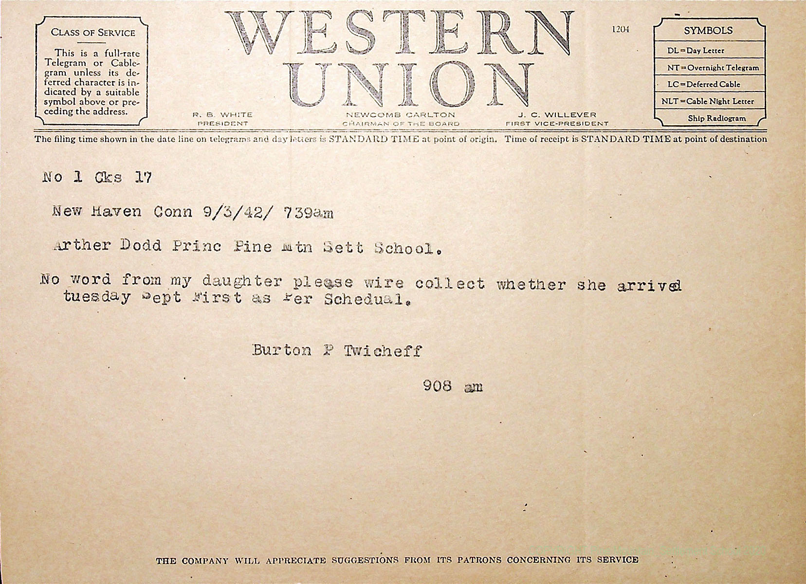 00015 (17) Western Union telegram. September 3, 1942. To Arthur Dodd from Burton P. Twichell. “No word from my daughter. Please wire collect whether she arrived Tuesday, September first, as per schedule.”