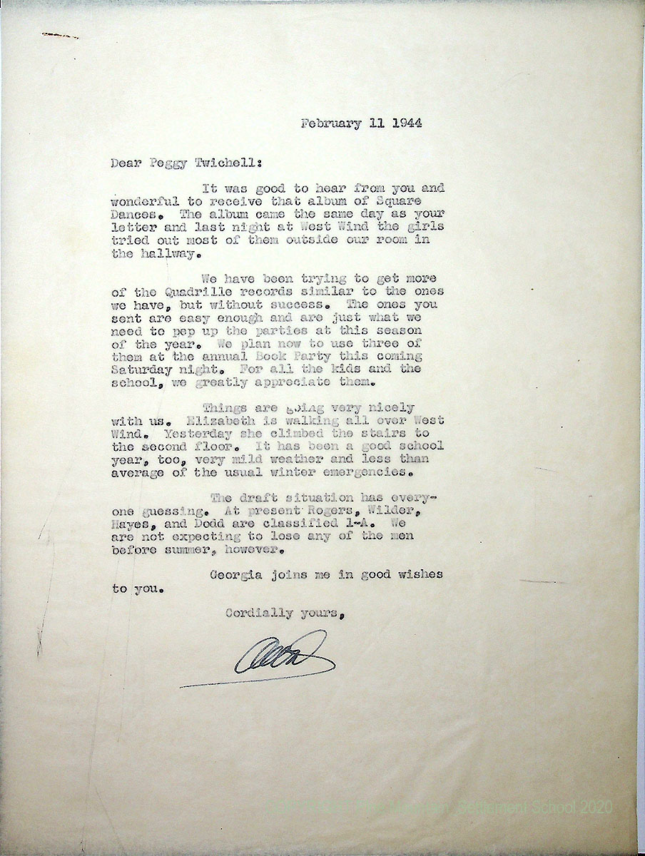 00015 (19) February 11, 1944. To Peggy Twichell from [indecipherable signature, likely Arthur Dodd]. Thanks her for the album of Square Dances; will use that at the book party. “We have been trying to get more Quadrille records similar to the ones we have….” Tells about his young daughter Elizabeth. “The draft situation has everyone guessing. At present Rogers, Wilder, Hayes, and Dodd are classified 1-A. We are not expecting to lose any of the men before summer, however.”
