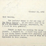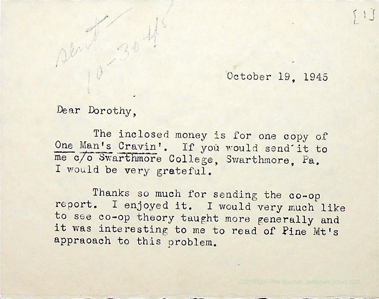 00015 (24) October 19, 1945. Typewritten note to “Dorothy” from [unsigned]. Encloses money for a copy of “One Man’s Cravin’” to be sent ℅ Swarthmore (PA) College. Enjoyed the co-op report, stating “I would very much like to see co-op theory taught more generally and it was interesting to me to read of Pine Mt’s approach to this problem.”