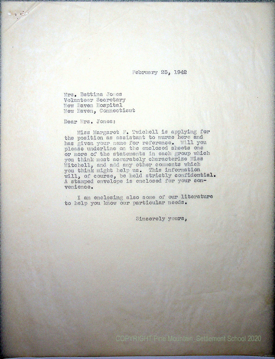 00015 (3) March 3, 1942. Typewritten letter to Mr. Morris from Condelia Kingman on “The Ojai Valley School” letterhead. “The Pine Mountain Settlement School has been of interest to me since the days of Cecil Sharp, as I have been a member of the E.F.D.S. of America for many years and have known Miss Welles (sic) and Kay Wright as well as Miss Karpeles, Douglas Kennedy and, of course, May Gadd, in connection with the Folk Dance School at Amherst and Long Pond. So it is with pleasure that I can recommend Miss Twichell….” Kingman describes Twichell’s time at Ojai Valley School since third grade and after college, mentioning her “integrity and dependability.”