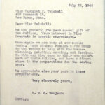 00015 (20) July 23, 1946. To Miss Margaret F. Twichell in New Haven, CT, from H.R.S. Benjamin, who thanks her for her annual gift of $10. Tells about students who remain at school during the summer to work at various tasks (“housecleaning, painting, canning, and farming”) to pay “part of their tuition and have a direct share in the preparations for the coming year.”
