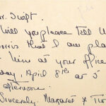 00015 (6) April 4, 1942. Handwritten note on postcard to Mr. Swift from Margaret F. Twichell, who asks him to tell Morris about meeting in Swift’s office.