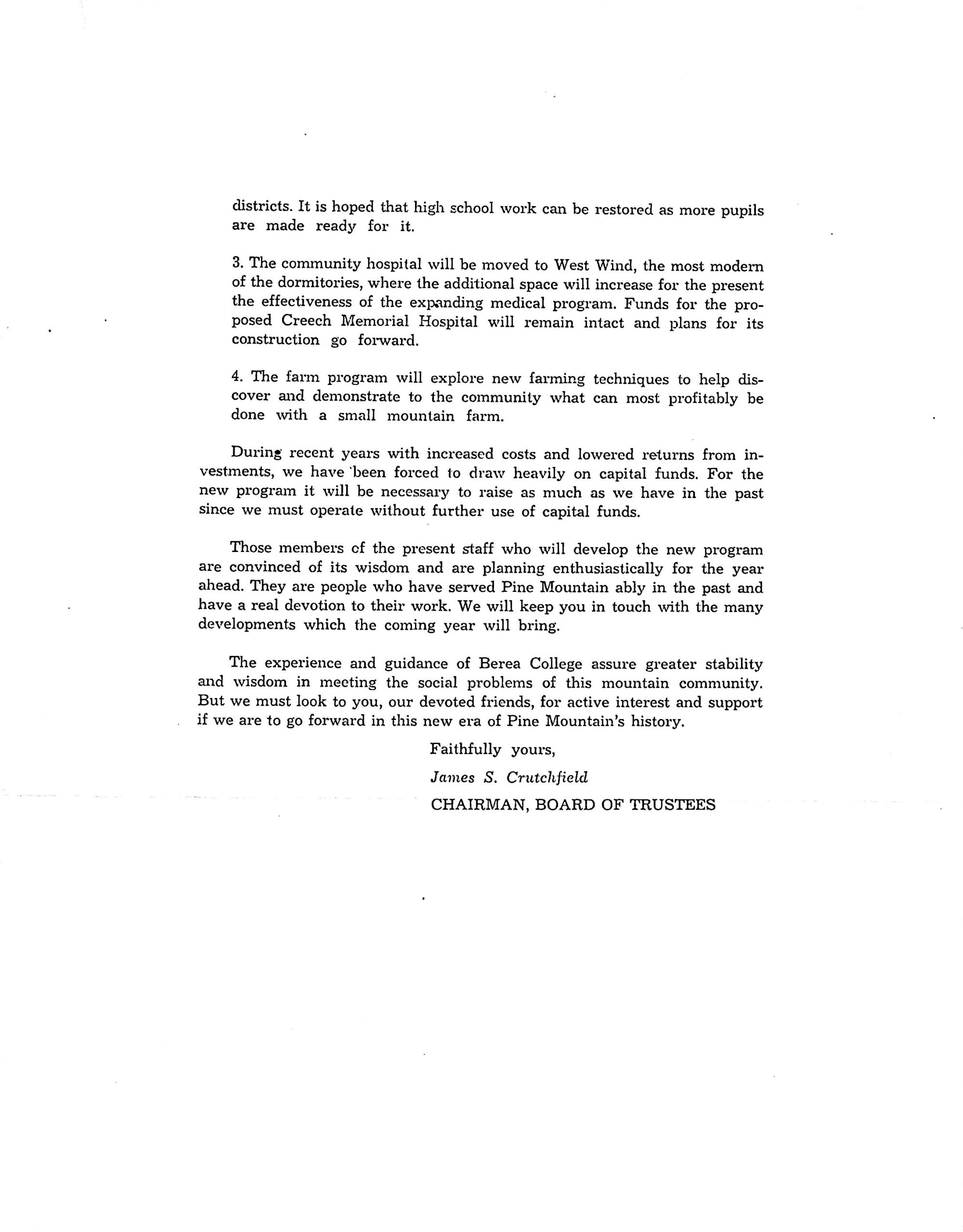 TAGS: “Dear Friend” fundraising letter, James S. Crutchfield, PMSS program changes, consolidated elementary school, boarding school, Board of Trustees decisions, Berea College relationship with PMSS, West Wind hospital, Creech Memorial Hospital, farm program, capital funds