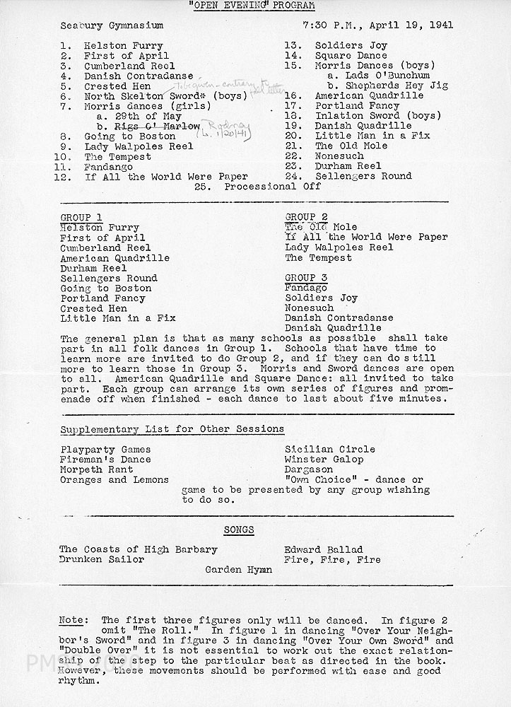 [011b 1941 Mountain Folk Festival] The “‘OPEN EVENING’ PROGRAM” lists folk dances and songs performed at the Seabury Gymnasium on April 19, 1941.