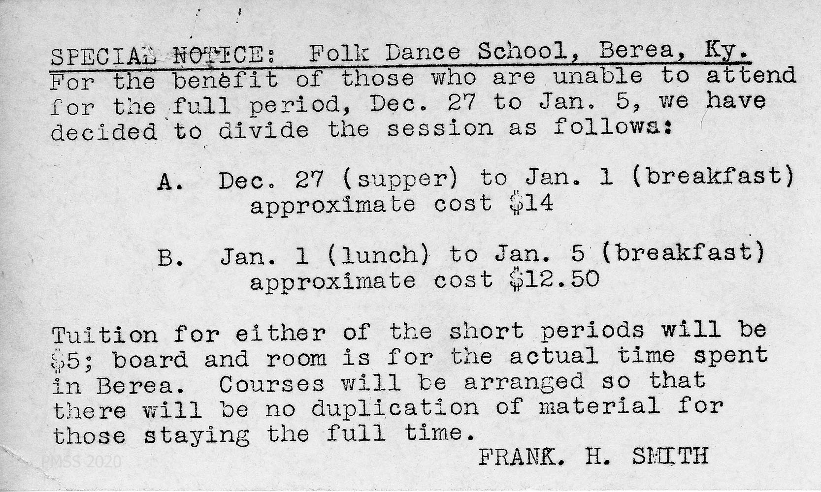 [02 1940 Berea] “THIRD FOLK DANCE SCHOOL – We announce with pleasure the third annual Folk Dance School sponsored by the Conference of Southern Mountain Workers to be held on the Berea College campus, December 27, 1940, to January 5, 1941. Miss May Gadd, Director of the Country Dance Society and a member of the Recreational Advisory Committee of the Conference, will again be in charge of the instruction. She will be assisted by Frank H. Smith, Recreational Director of the Conference, who will be responsible for the organization of the School.” Also described: Program, Equipment, Expenses and Accommodations, Registration.