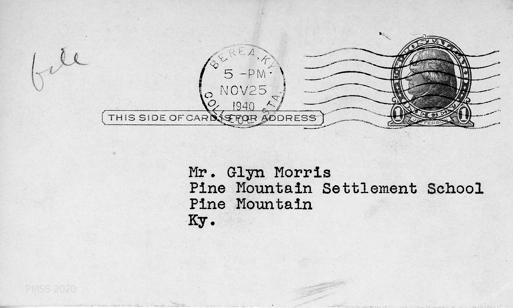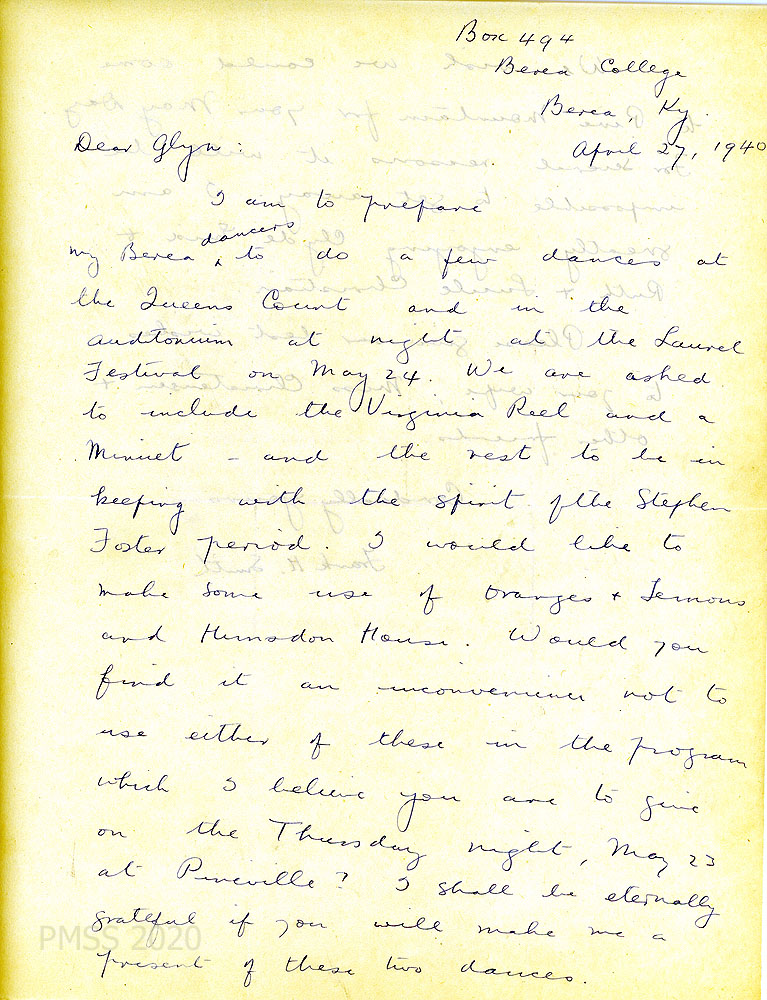 [08 1940 Laurel], [08a 1940 Laurel] April 27, 1940.Two-page handwritten letter to Glyn [Morris] from Frank [H. Smith], Berea College, [08] who informs Morris of his dance selections at the May 24th Laurel Festival; asks to coordinate his program with Morris’s May 23rd program at Pineville. [08a] “We are greatly enjoying Clyde Enix & Ruth & Lucille Christian.”
