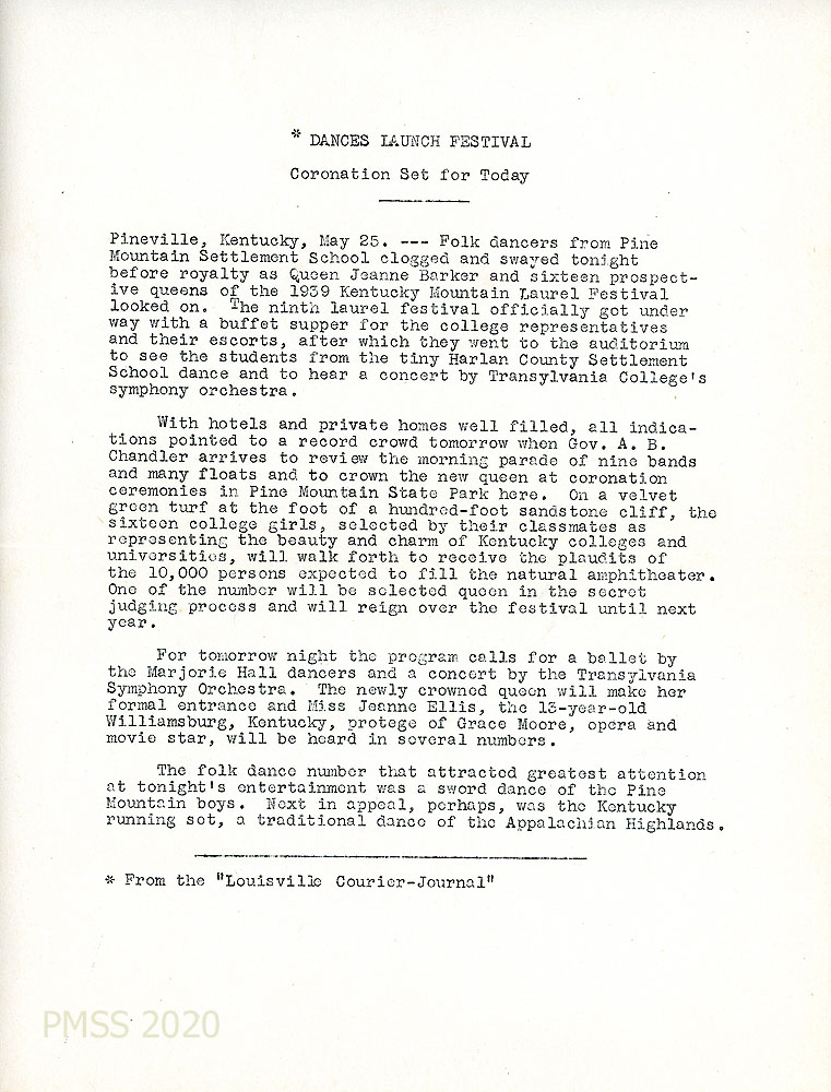 [01 1939] May 25, 1939. Typewritten transcription of a newspaper article from the Louisville Courier-Journal titled “DANCES LAUNCH FESTIVAL Coronation Set for Today,” Pineville, Kentucky.