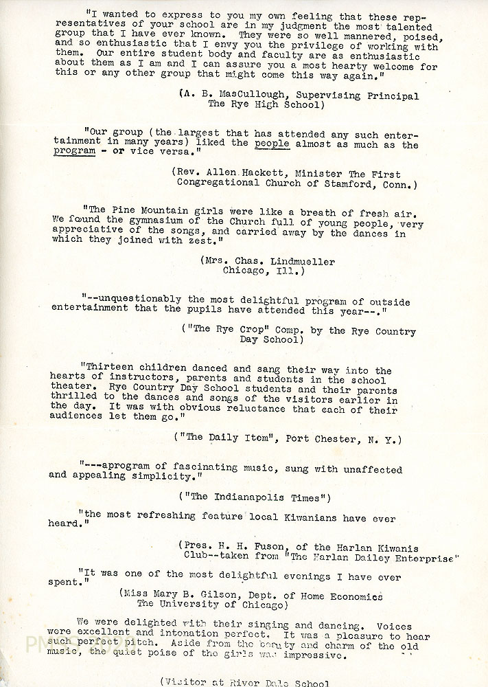 [02 1939 riverdale] A list of quotes from attendees and newspaper reporters praising the dance festival at River Dale School and the Rye Country Day School.
