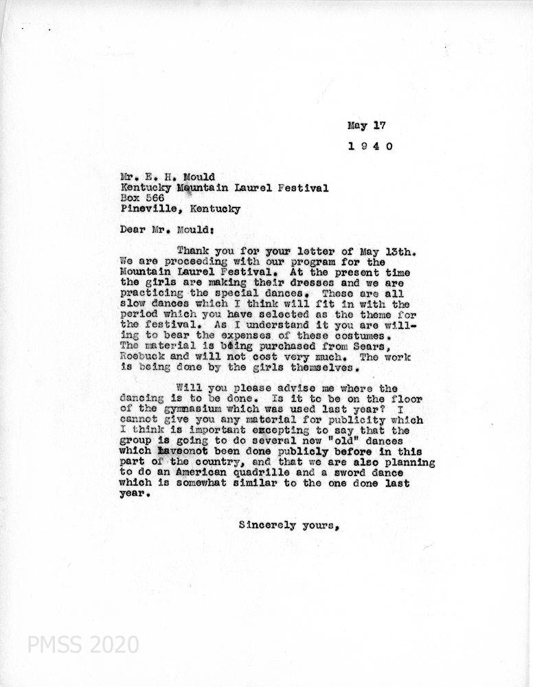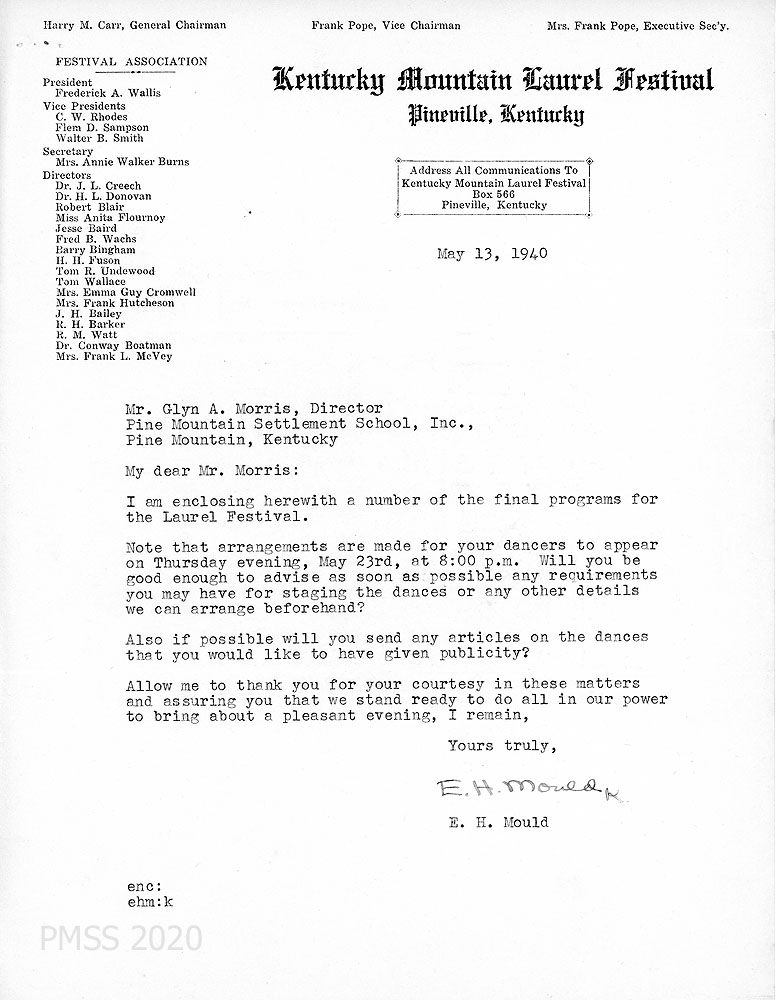 [12 1939-41] May 13, 1940. Typewritten letter to Glyn Morris from Mr. E.H. Mould on letterhead for “Kentucky Mountain Laurel Festival, Pineville, Kentucky.” Encloses final programs for the Laurel Festival; provides date and time for the dances; asks for any articles on the dances for publicity.