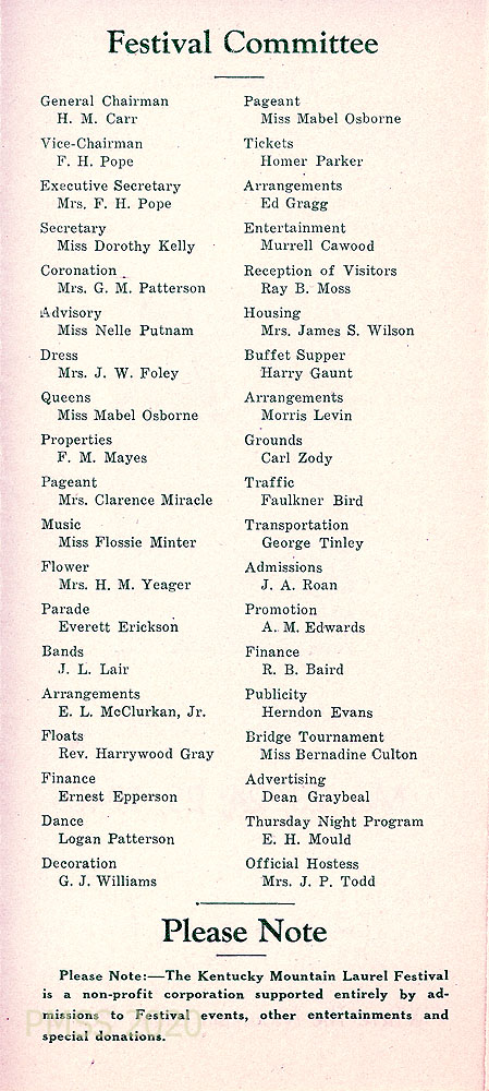 [02 1940 Laurel] “Festival Committee”: A page from the program that lists the names of the members and their responsibilities. Ends with a note that the festival is a non-profit corporation.