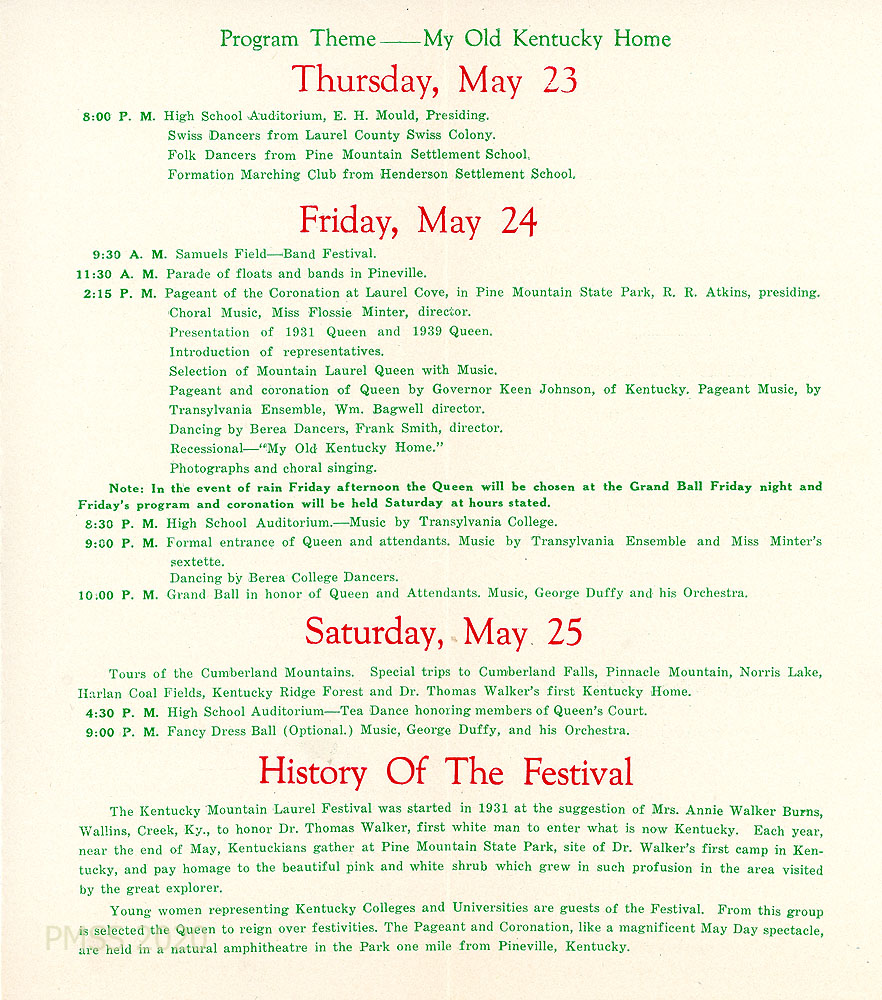 [01 1940 Laurel] May 23 – 25, 1940. Program cover for the “Tenth Annual Kentucky Mountain Laurel Festival” with a photograph of the 1939 queen, Miss Dorothy Ramey, Transylvania College. Location: Pine Mountain State Park, Pineville, Ky.