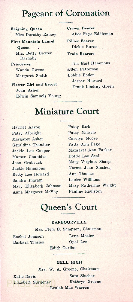 [05 1940 Laurel] A page from the program with lists of participants in the “Pageant of Coronation,” “Miniature Court,” and “Queen’s Court” (Barbourville and Bell High).