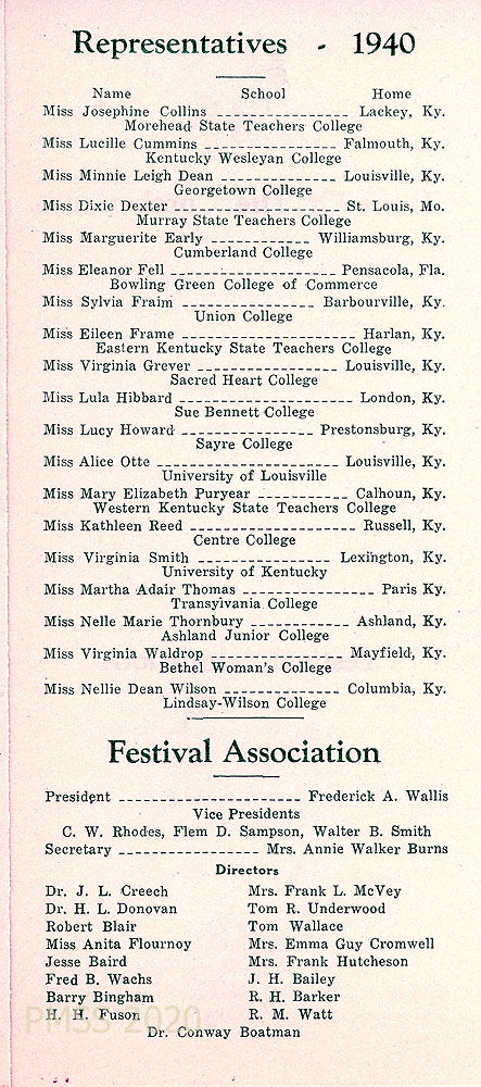 [06 1940 Laurel] A page from the program titled “Representatives – 1940,” which lists the names, schools and home towns. Also, a list of members of the “Festival Association.”