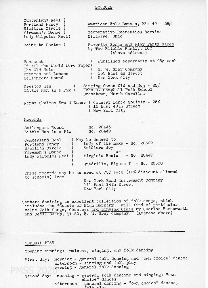 [011c 1941 Berea] List of “SOURCES” for each of the folk dances and folk songs. “GENERAL PLAN” is the agenda for the opening evening and the first and second day.