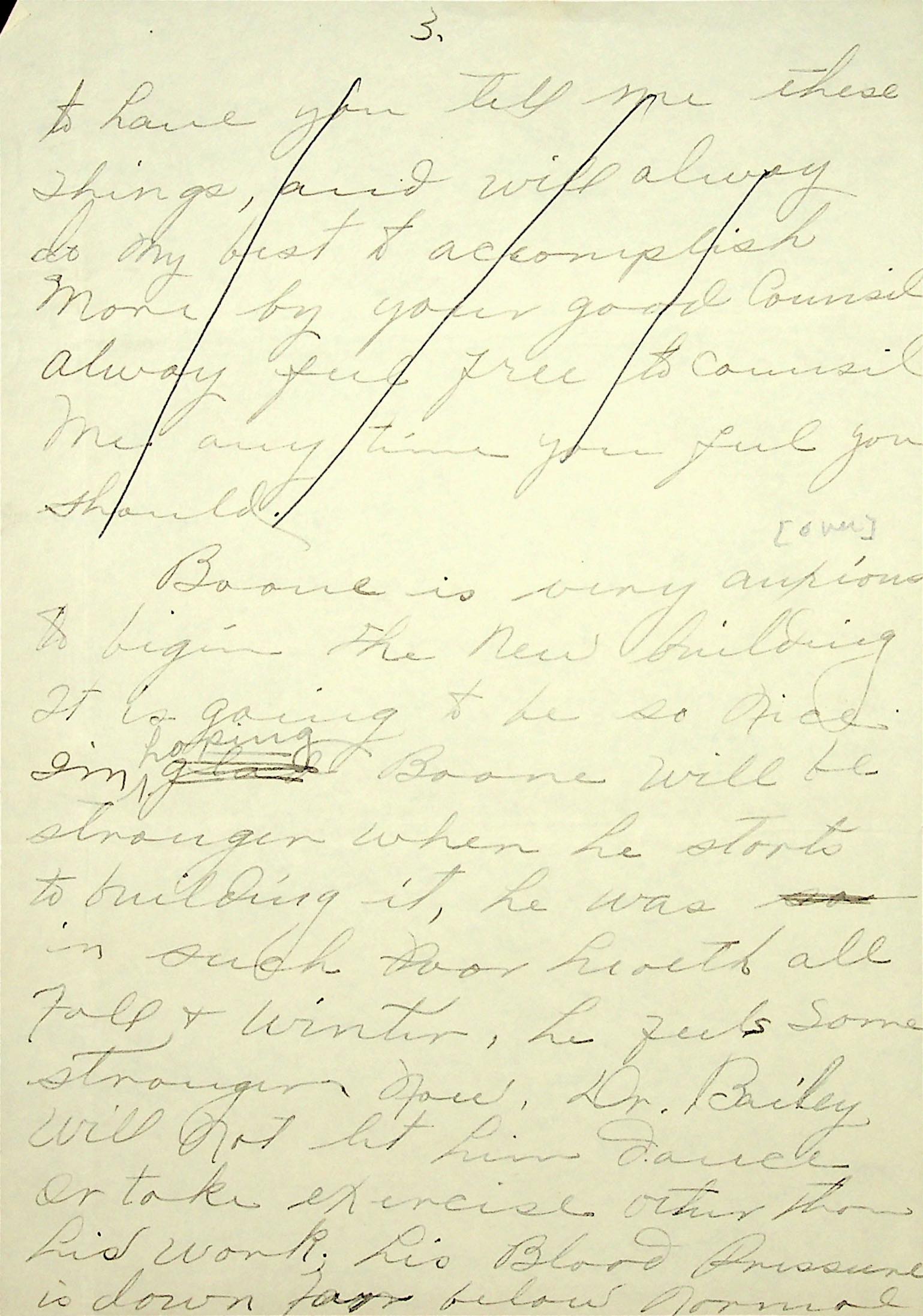(33) (34) (35) (36) N.D. Six pages of a partial letter to [no salutation, likely Miss Pettit] from [unsigned, likely Mrs. Callahan]. (33, page 3) (Upper half of page, is crossed off, including “…I will always do my best to accomplish more by your good counsel.”) Describes Boone’s current health, which is improving. Mentions Dr. [Clark] Bailey; Boone’s low blood pressure & (34, page 4) weak heart. He is being urged to see Dr. Abell. (35, page 5) This letter is to Miss Pettit because “anything Miss Pettit suggests or thinks should be.” (36, page 6) Asks Pettit to write Boone that he should get “out for his whole month and to let his mind rest of all cares at home.” [Images are missing before and after 33-36.]