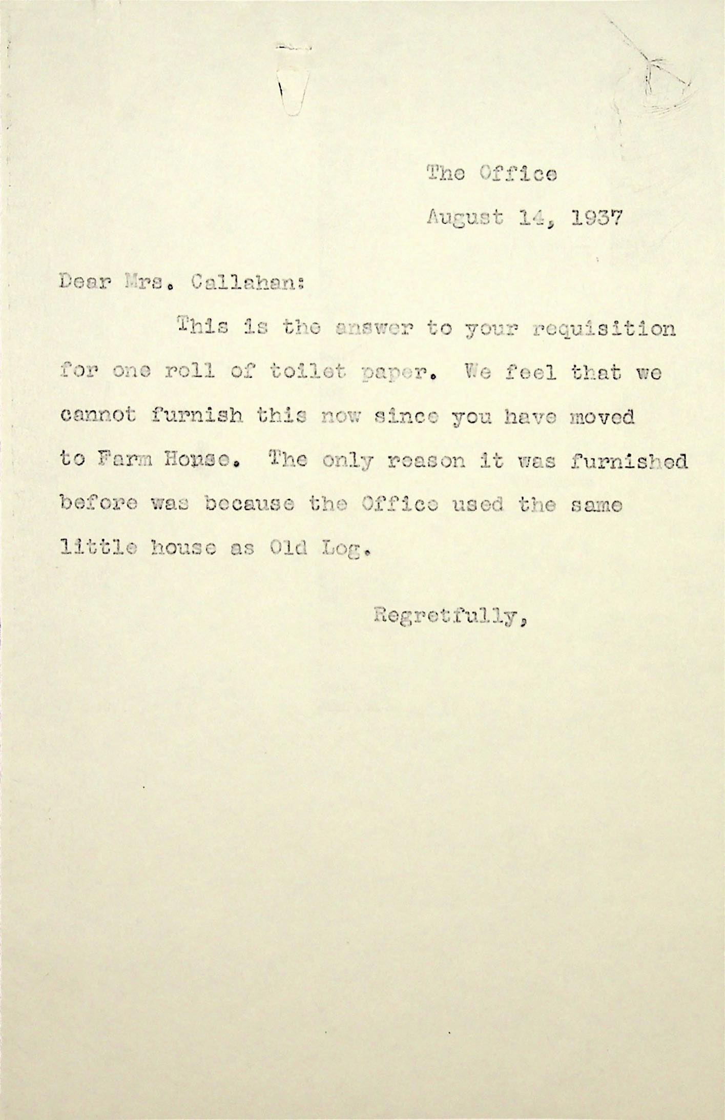(48) August 14, 1937. To Mrs. Callahan from “The Office,” which cannot supply the item she requested because she moved to Farm House.