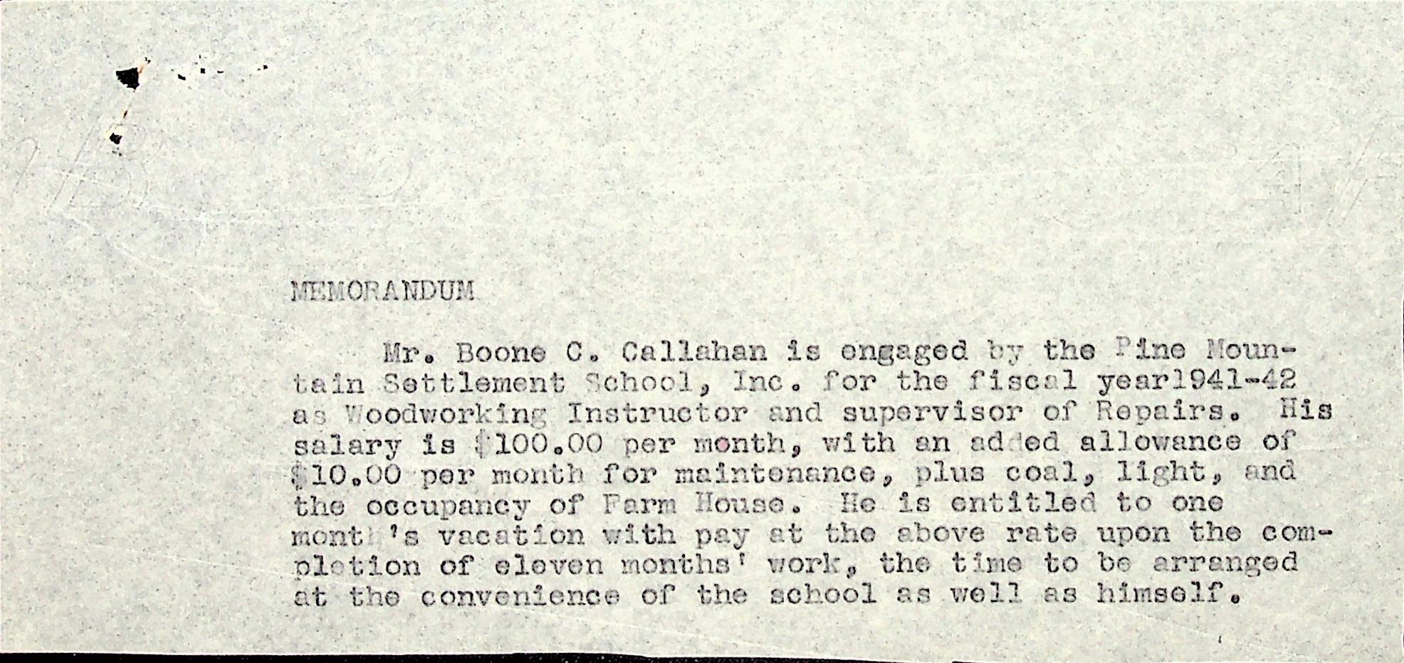 (62) N.D. Memorandum from [unsigned]. Contract for Mr. Boone C. Callahan’s engagement by PMSS for fiscal year 1941-42 as Woodworking Instructor and Supervisor of Repairs at “$100.00 per month with added allowance of $10.00 per month for maintenance, plus coal, light, and the occupancy of Farm House and one month’s vacation.