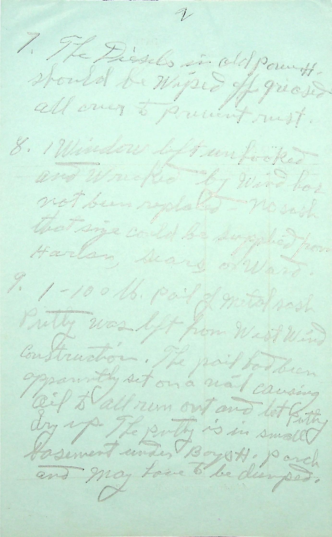 (68) (69) (70) (71) January 20, 1942. Four-page handwritten “Notes of Information Left by Boone Callahan,” covering (68) lumber (size, location, ownership). “Am sorry Mrs. [Mary] Rogers never completed and returned designs and writing to go on Guest Book. Left in shop unfinished.” (69, page 2) Care of “the Diesels in the old Power H[ouse].” Damaged window; location of metal sash putty from West Wind construction; (70, page 3) lumber from workshops; lumber under Shop floor; hot water tank valve is leaking in Laurel House basement; location of asphalt roofing shingles and eave trough & fittings; (71, page 4) [Written on a blank Requisition form; writing is too faded to fully decipher.] nails; cherry lumber; kerosene for the Infirmary.