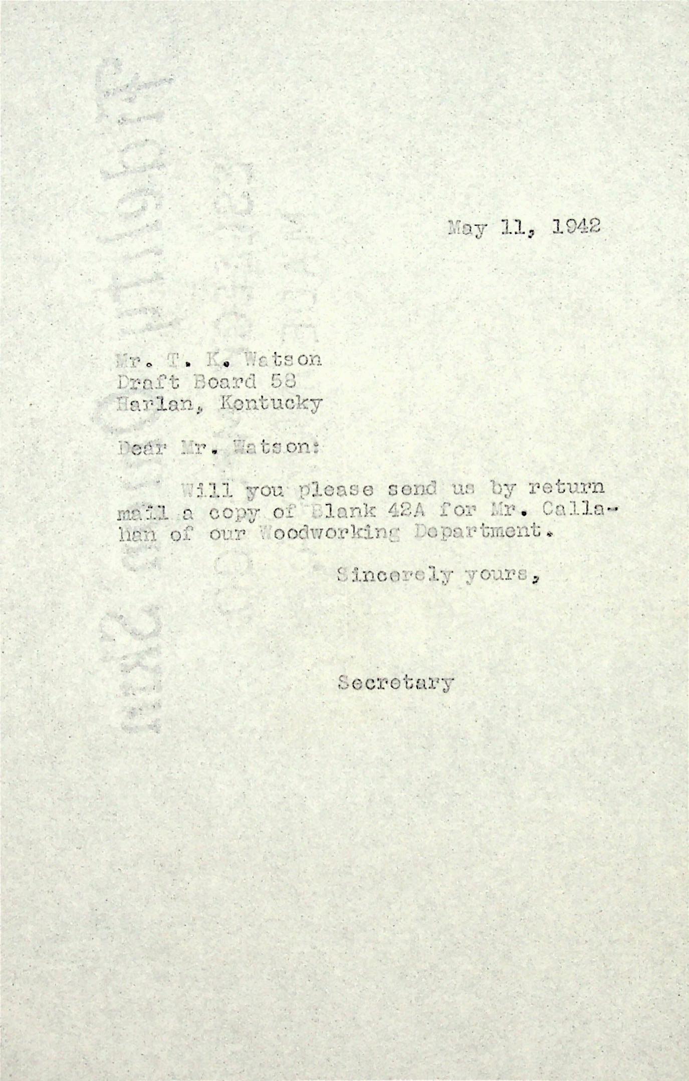 (77) May 11, 1942. To Mr. T.K. Watson, Draft Board, Harlan, KY, from [unsigned], Secretary, Asking for a copy of Blank 42A for Mr. Callahan.