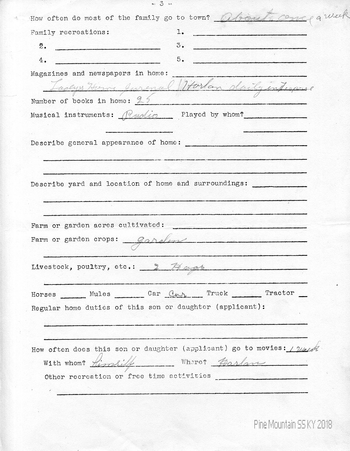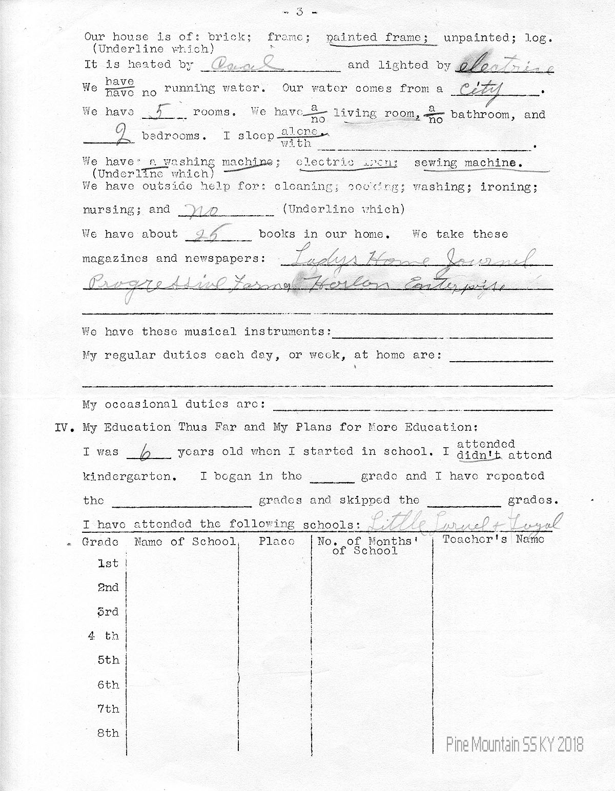 Our house is of painted frame; heated by coal and lighted by electric[ity]. We have running water from the city. We have 25 books and take these publications: Lad[ies] Home Journal, Progressive Farms, Harlan Enterprise. I attended Little Laurel and Loyal schools. …
