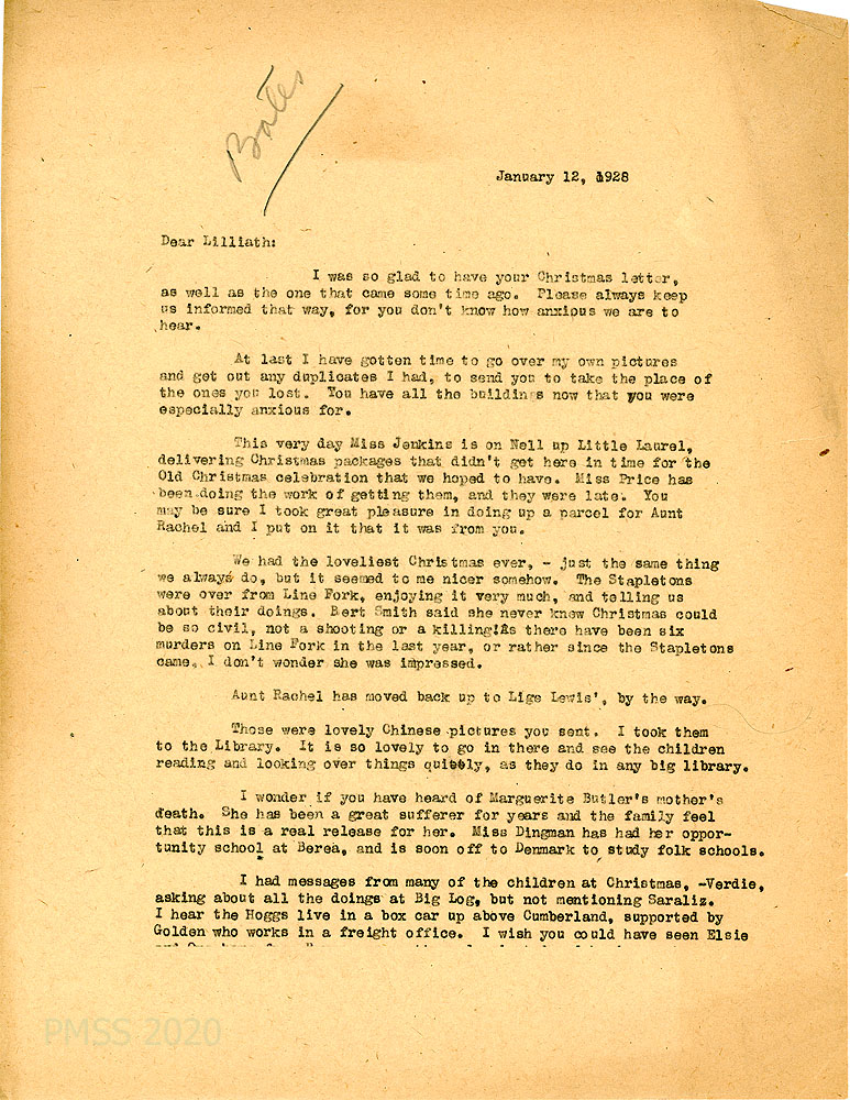 [001] January 12, 1928. To Lilliath Robbins Bates from [truncated letter], who is glad to have Lilliath’s letters. Will send Lilliath duplicate photos “to take the place of the ones you lost. You have all the buildings now that you were especially anxious for.” Miss Jenkins is delivering late-arriving Christmas packages to the community; mentions Miss Price; Aunt Rachel who has moved back to Lige Lewis’s. Describes PMSS’s Christmas; mentions the Stapletons (Dr. Ida Stapleton and Rev. Robert Stapleton, Bert Smith. Appreciates the Chinese pictures Lilliath sent. Mentions the death of Marguerite Butler’s mother; Miss Dingman’s opportunity school at Berea and her plans to go to Denmark to study folk schools. Has heard from former students: Verdie, the Hoggs, Elsie…. [The rest of page is truncated.]