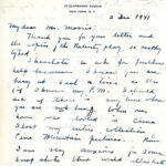 [004] November 20, 1941. To Mrs. M.S. (Lilliath) Bates from [unsigned, likely Morris], who appreciates her letter and gift. “Perhaps you would be glad to know that our own boys and girls raised money for China last year and the year before, a part of which they obtained by eating a meal of corn bread and milk on the Sunday before Christmas.” Morris is sending, under separate cover, a copy of the Nativity Play. “We delight in giving it here and find it one of the outstanding experiences of the year, if not the most outstanding.”