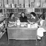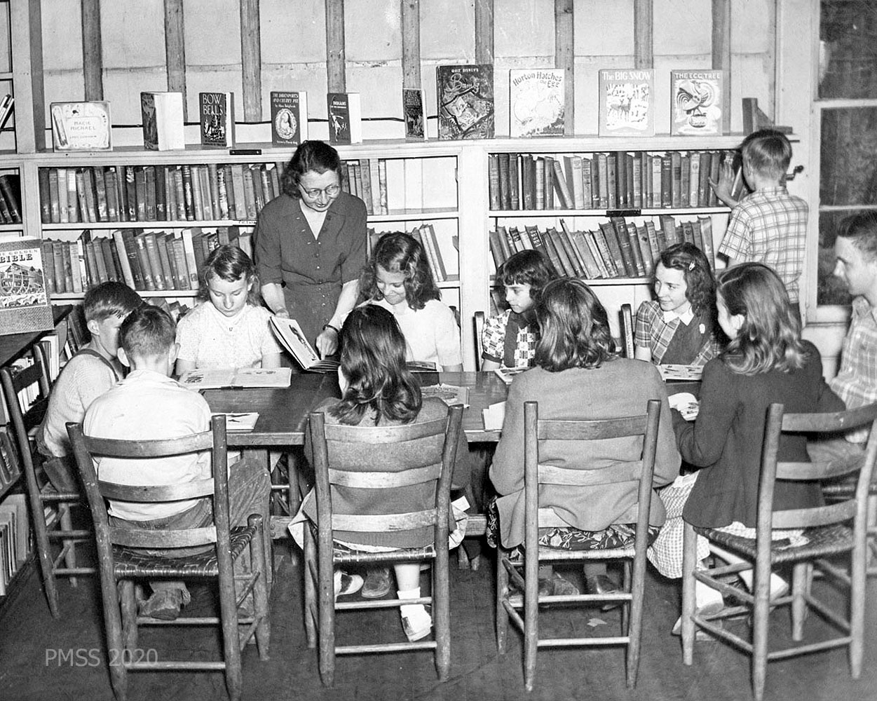 03a Librarian, Miss Gampert, and students. Early 1950s in Burkham Schoolhouse II Library. [88_life_work_school_library_003a]