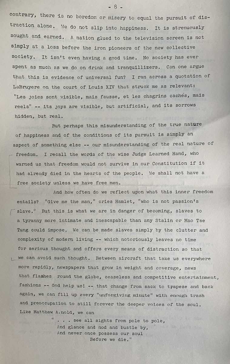 But perhaps this misunderstanding of the true nature of happiness and of the conditions of its pursuit is simply an aspect of something else — our misunderstanding of the real nature of freedom. I recall the words of the wise Judge Learned Hand, who warned us that freedom would not survive in our Constitution if it had already died in the hearts of the people. We shall not have a free society unless we have free men.