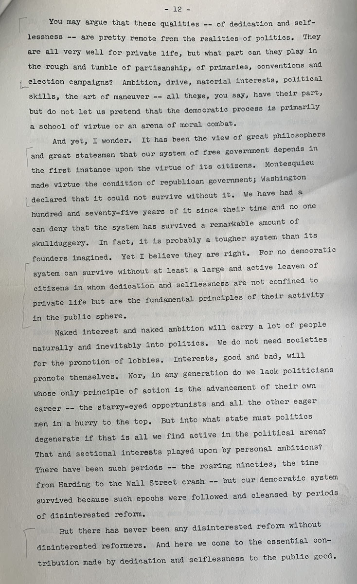 And yet, I wonder. It has been the view of great philosophers and great statesmen that our system of free government depends in the first instance upon the virtue of its citizens. Montesquieu made virtue the condition of republican government; Washington declared that it could not survive without it. We have had a hundred and seventy-five years of it since their time and no one can deny that the system has survived a remarkable amount of skullduggery. In fact, it is probably a tougher system than its founders imagined. Yet I believe they are right. For no democratic system can survive without at least a large and active leaven of citizens in whom dedication and selflessness are not confined to private life but are the fundamental principles of their activity in the public sphere.