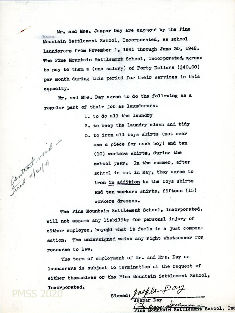 [1] N.D. Carbon copy of typewritten contract between Pine Mountain Settlement School, Incorporated and Mr. and Mrs. Jasper Day, who were engaged as school launderers from November 1, 1941 through June 30, 1942. The couple would receive $40.00 per month for their services. They agreed to the duties of the position, which were to do all laundry, keep the laundry clean and tidy, iron shirts for boys and workers, and workers’ dresses in the summer. The contract states that PMSS “will not assume any liability for personal injury of either employee, beyond what it feels is a just compensation. The undersigned waive any right whatsoever for recourse to law.” Signed by Jasper Day and Barbara Spelman [PMSS Secretary]. Notation in margin: “Contract void – fired 11/21/41”