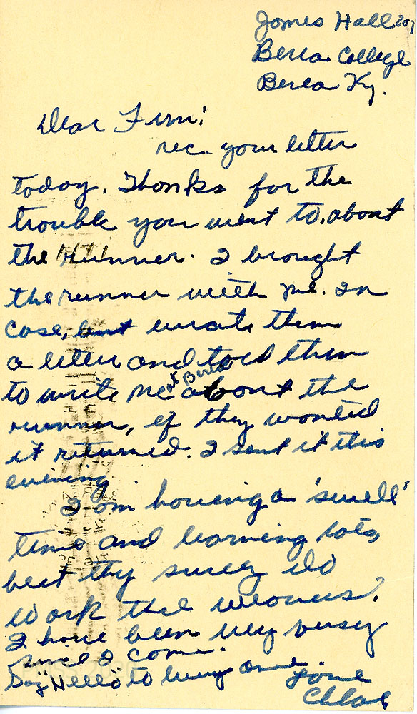 [09] Postmarked July 26, 1939(?) from Berea (KY) College Station. Address side of postcard, addressed to Miss Fern Hall, Pine Mountain S.S.