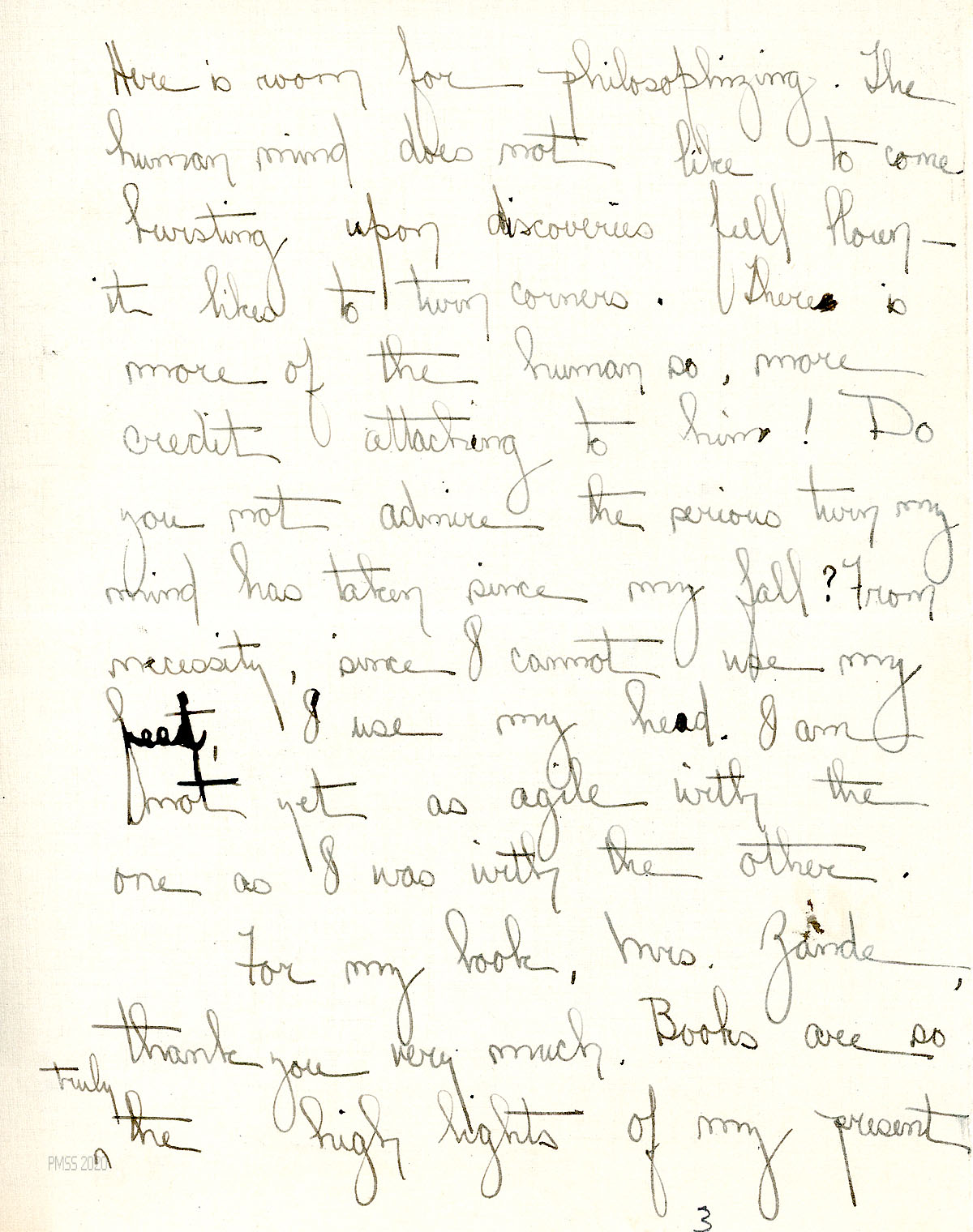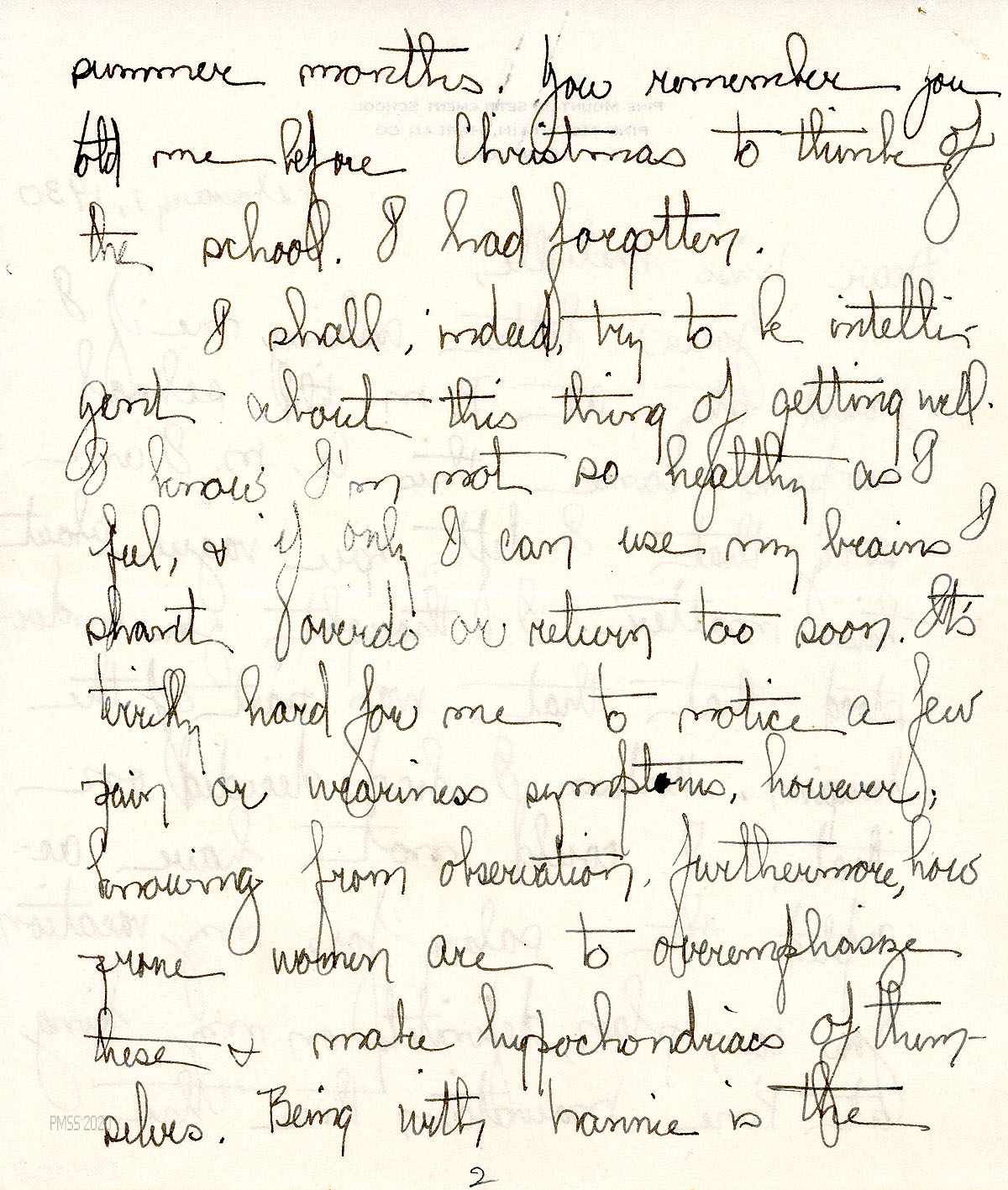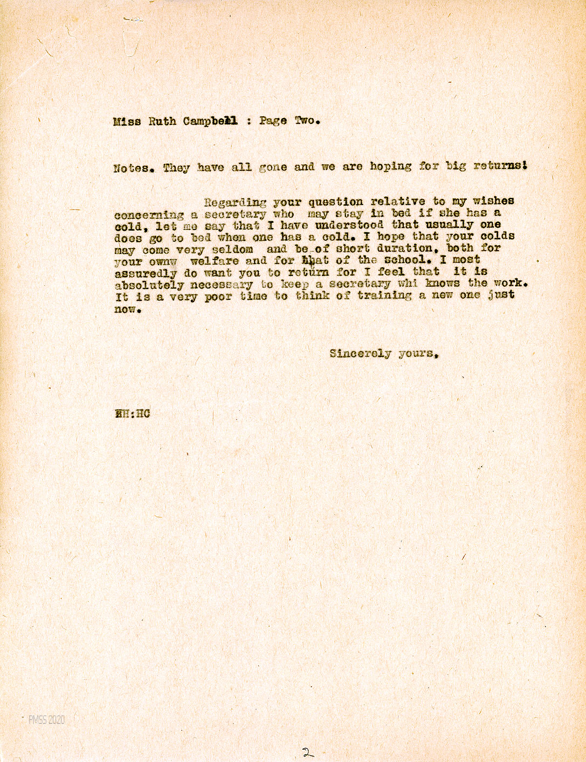 [020] January 29, 1930. To Ruth [Campbell] at Women’s Hospital, Cleveland, OH, from [unsigned, apparently Melville]. Asks Campbell if she will stay with Mr. [Hubert] Hadley (PMSS Director) until school re-opens; “…[R]emember to be really well before you do come.” Mrs. Weber is leaving mid-February, so another temporary person will need to be found to fill in until Campbell’s return. Mentions Mr. Meldrum and Mrs. Roan.